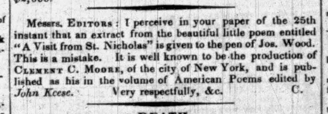 Messrs. EDITORS: I perceive in your paper of the 25th instant that an extract from the beautiful little poem entitled "A Visit from St. Nicholas" is given to the pen of Jos. Wood. This is a mistake. It is well known to be the production of CLEMENT C. MOORE, of the city of New York, and is published as his in the volume of American Poems edited by John Keese.