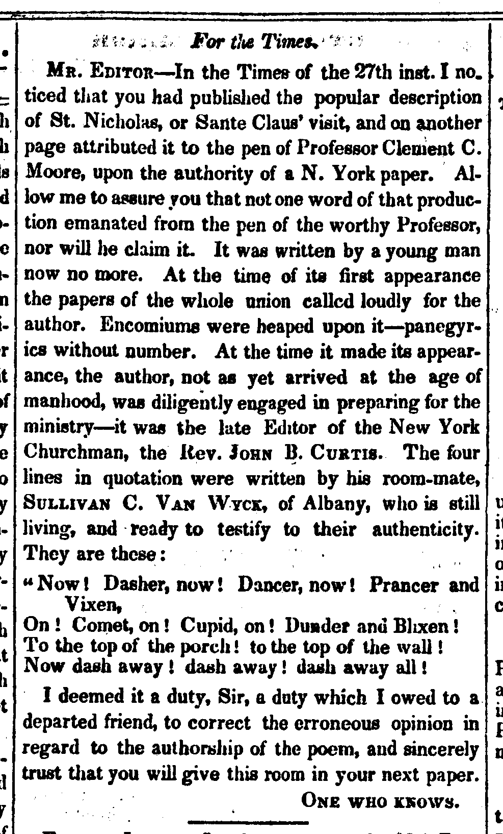 MR. EDITOR— In the Times of the 27th inst. I noticed that you had published the popular description of St. Nicholas, or Sante Claus’ visit, and on another page attributed it to the pen of Professor Clement C. Moore, upon the authority of a N.Y. paper. Allow me to assure you that not one word of that production emanated from the pen of the worthy Professor, nor will he claim it. It was written by a young man now no more. At the time of its first appearance the papers of the whole union called loudly for the author. Encomiums were heaped upon it—panegyrics without number. At the time it made its appearance, the author, not as yet arrived at the age of manhood, was diligently engaged in preparing for the ministry—it was the late Editor of the New York Churchman, the Rev. JOHN B. CURTIS. The four lines in quotation were written by his room-mate SULLIVAN C. VAN WYCK, of Albany, who is still living, and ready to testify to their authenticity. They are these: