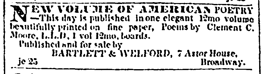 Another job that occupied Professor Moore in 1844 involved the selection and ordering of his poems for publication. At the urging of family and friends, Moore would include “A Visit from St. Nicholas” in his collection of Poems by Clement C. Moore, issued in New York on June 25th by Bartlett & Welford.