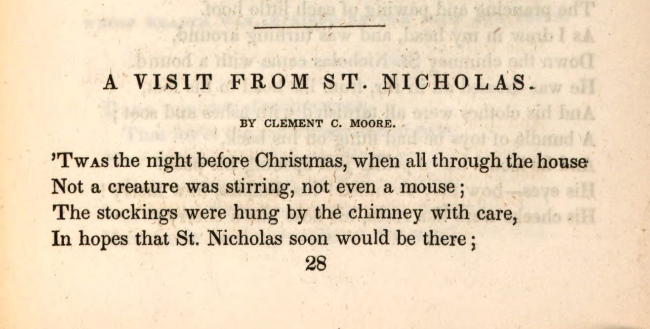 The October 1837 issue of the New-York Review gave an excerpt from “a visit from St. Nicholas, by Clement C. Moore,” deeming it “one of the most appropriate passages of the New-York Book.”