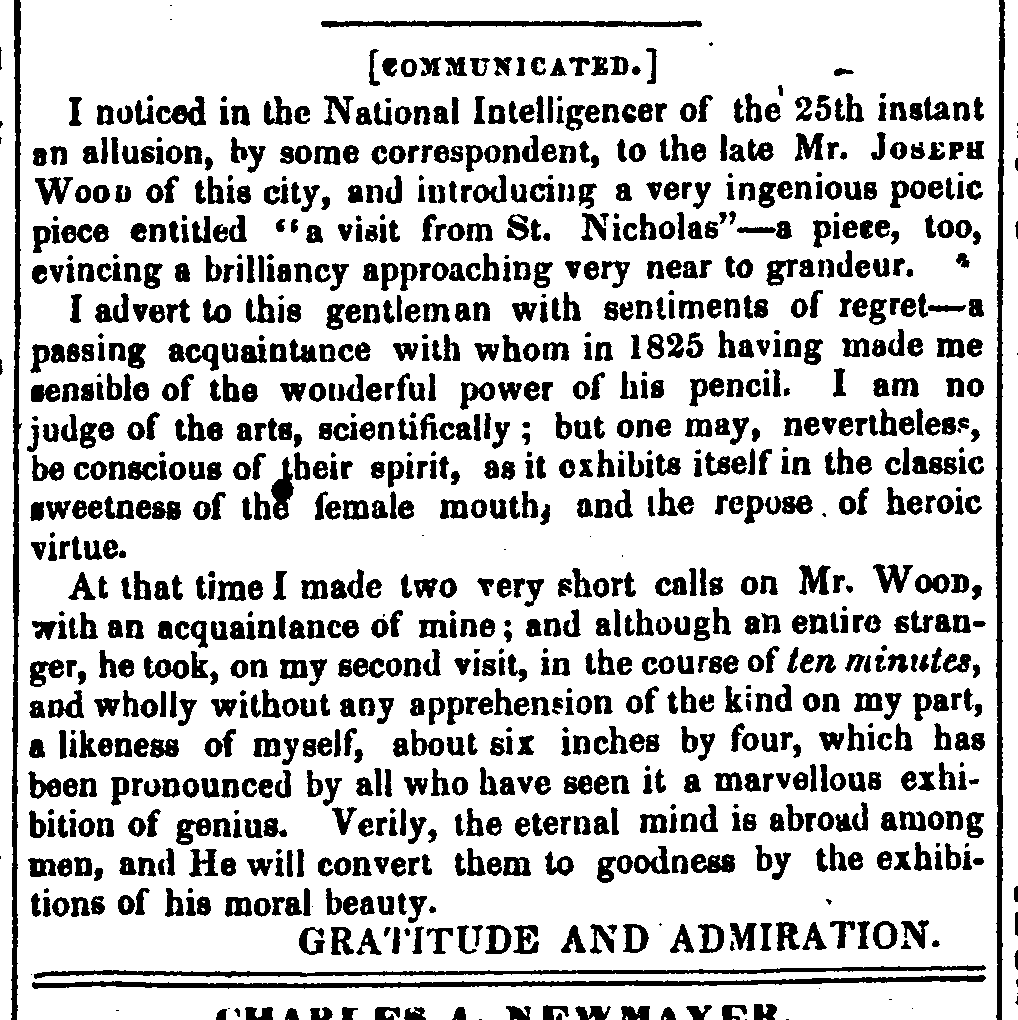 I noticed in the National Intelligencer of the 25th instant an allusion, by some correspondent, to the late Mr. JOSEPH WOOD of this city, and introducing a very ingenious poetic piece entitled “a visit from St. Nicholas”—a piece, too, evincing a brilliancy approaching very near to grandeur.