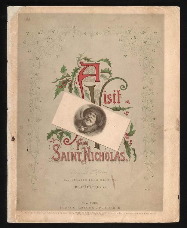 Reprinted on Christmas Day 1871 in the Rochester Democrat and Chronicle. For a later 19th century account, see the “Life of Clement C. Moore, LL,D” by William S. Pelletreau in the illustrated Visit of Saint Nicholas (New York: G. W. Dillingham Co., 1897) pages 17-18.