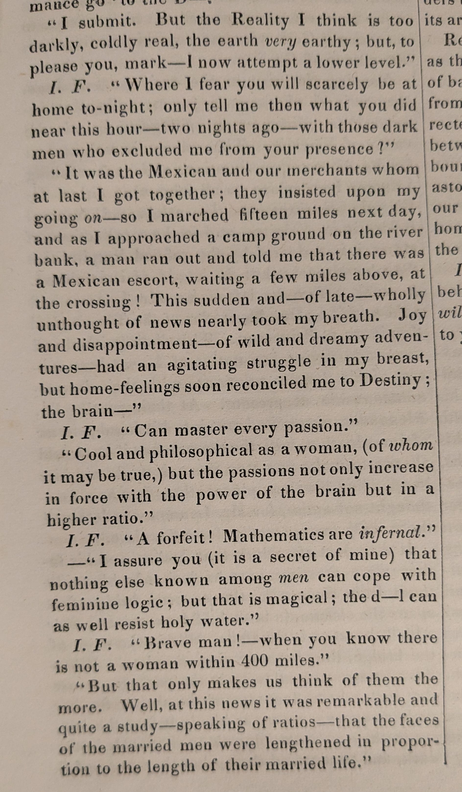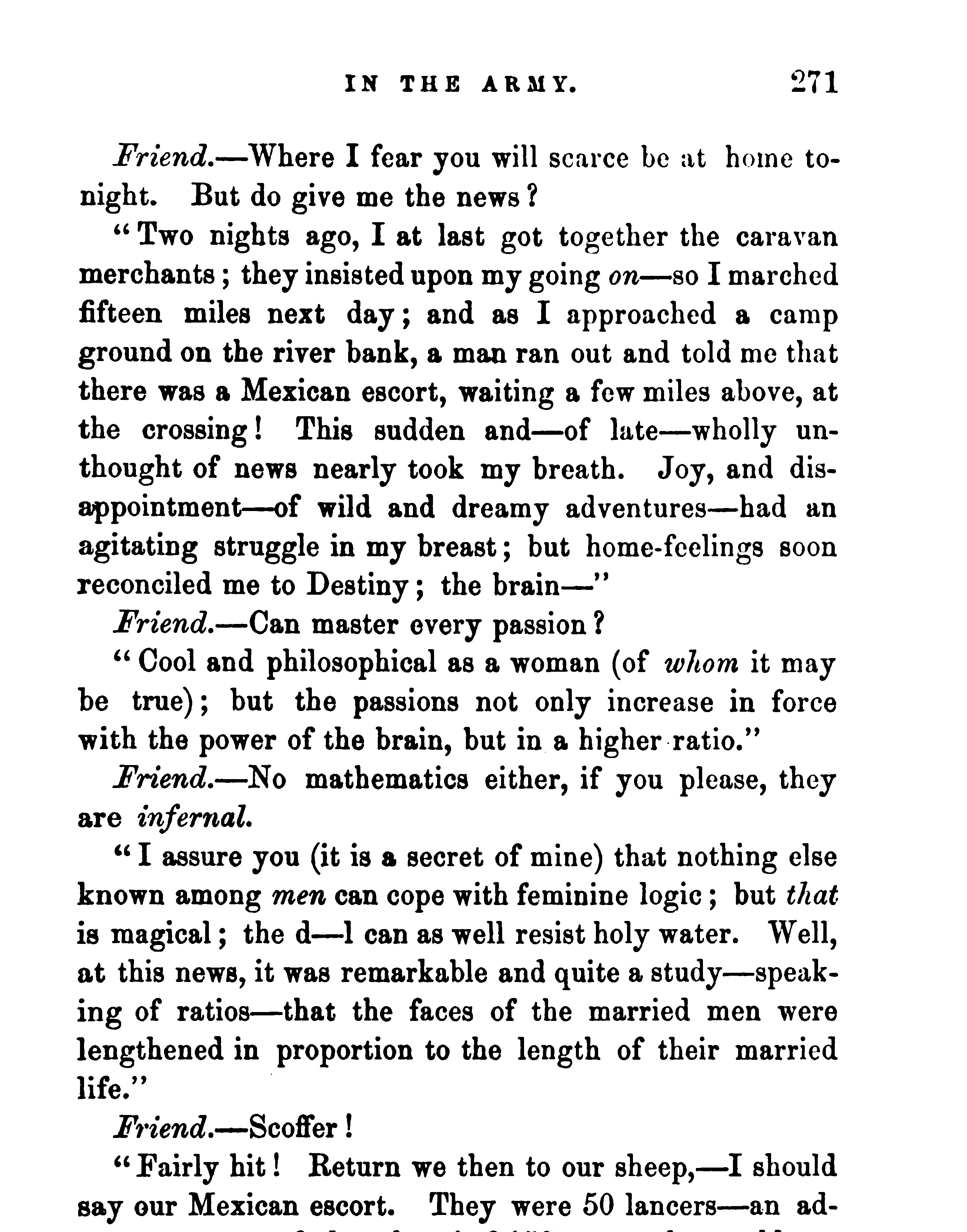 “ I assure you (it is a secret of mine) that nothing else known among men can cope with feminine logic; but that is magical; the d — l can as well resist holy water. Well, at this news, it was remarkable and quite a study — speaking of ratios — that the faces of the married men were lengthened in proportion to the length of their married life.”