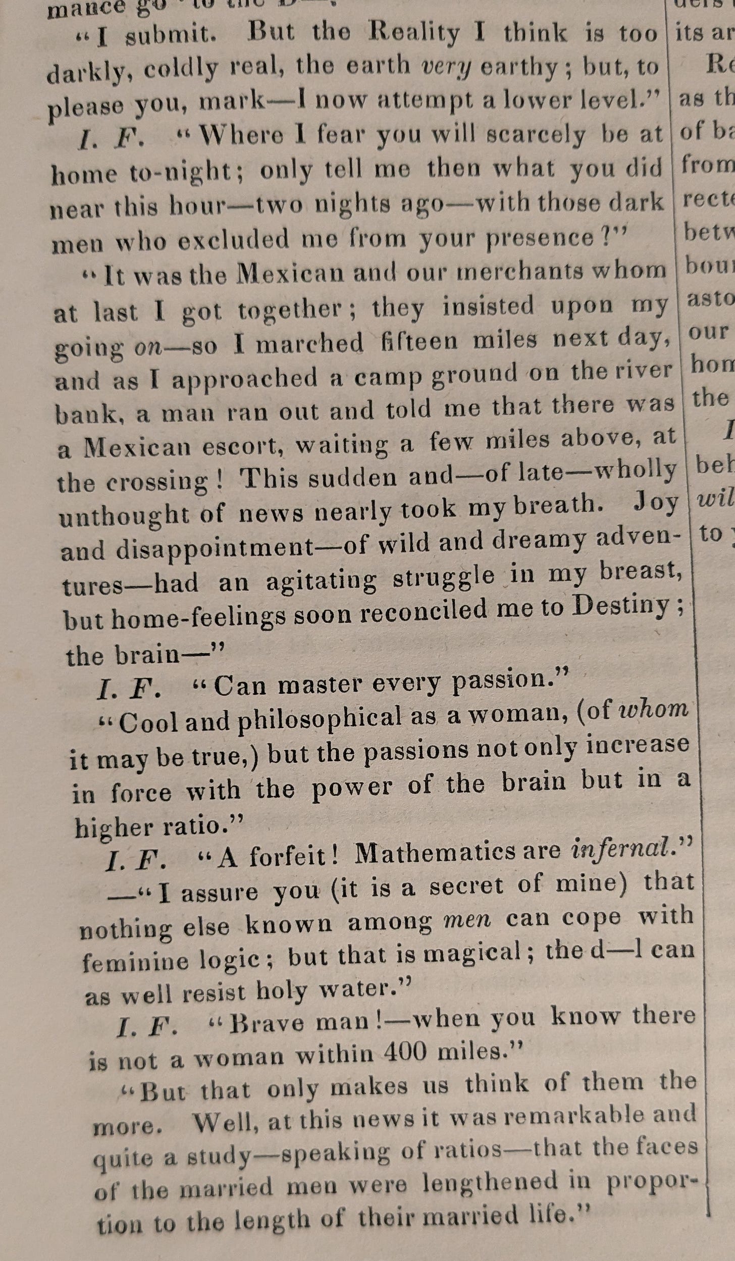 Mathematics of head v. heart, idiosyncratically expressed in terms of relative proportion, as a ratio. Likewise (though more as a gag) long faces of married men v. bachelors are also described mathematically as a ratio. Math as a discipline, however, is frankly conceded to be “infernal.” When the Captain starts to explain how he managed to reconcile himself to suddenly losing any chance of “wild and dreamy adventures” in New Mexico, he says “the brain—” but gets no further on his own.