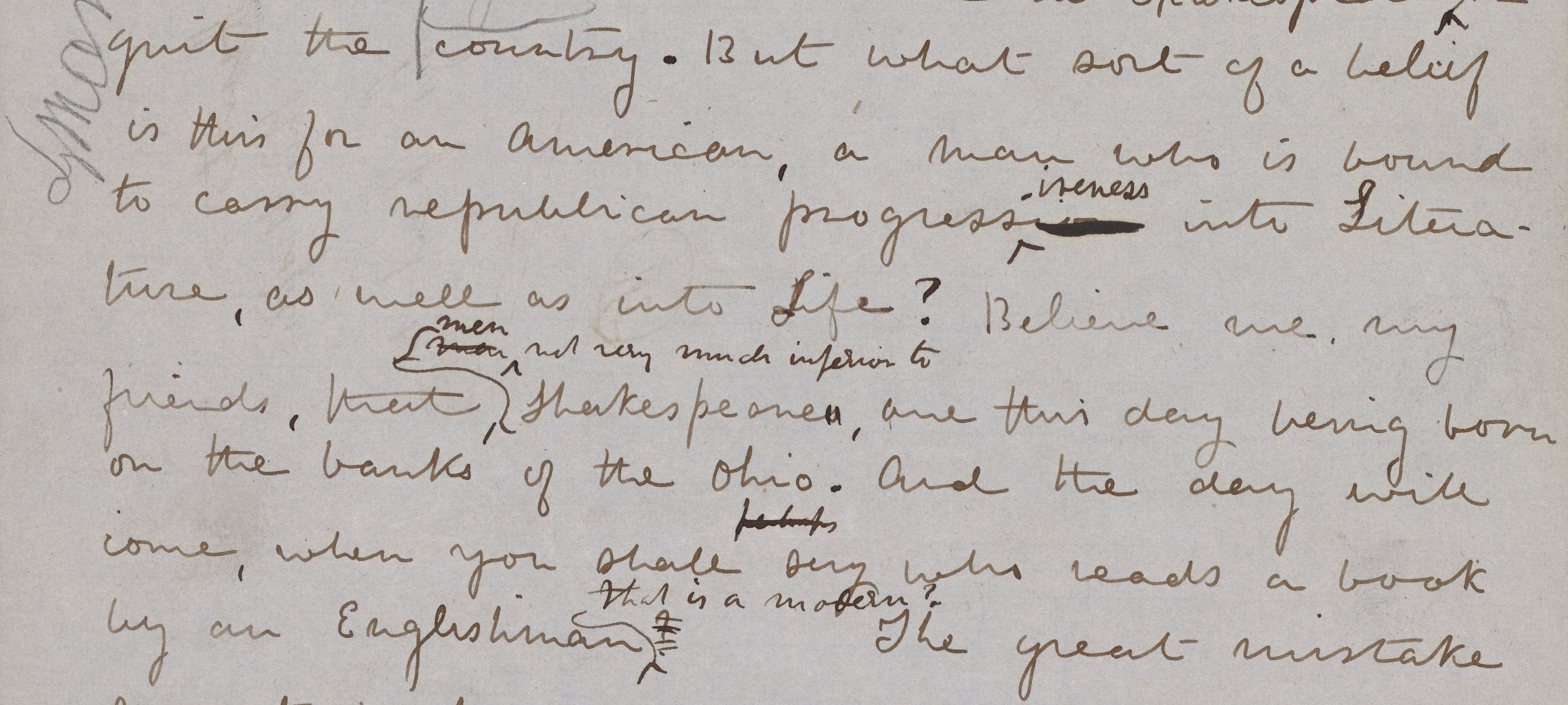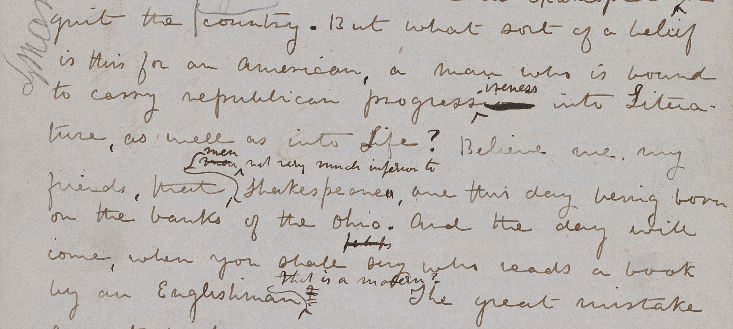 You must believe in Shakespeare’s unapproachability, or quit the country. But what sort of belief is this for an American, an man who is bound to carry republican progressiveness into Literature, as well as into Life? Believe me, my friends, that Shakespeares are this day being born on the banks of the Ohio. And the day will come, when you shall say who reads a book by an Englishman?4