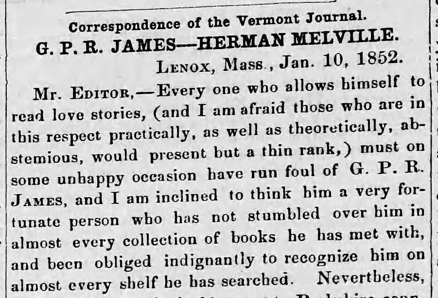In any event, by January 1852 James and Melville made easy targets for Berkshire rumormongers. Both great authors were coupled at least nominally by Mathew Henry Buckham aka “Maherbal” in published correspondence of the Windsor, Vermont Journal.