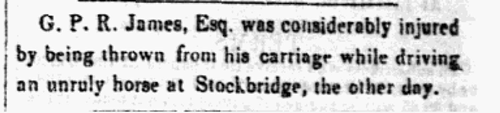 August 1851. James injured in carriage accident “while driving an unruly horse at Stockbridge.” Some journalists used the occasion to make fun of of James’s writing style; for example in the article “Two Ways of Telling a Story” that appeared in the Pittsfield Sun on September 15, 1851.