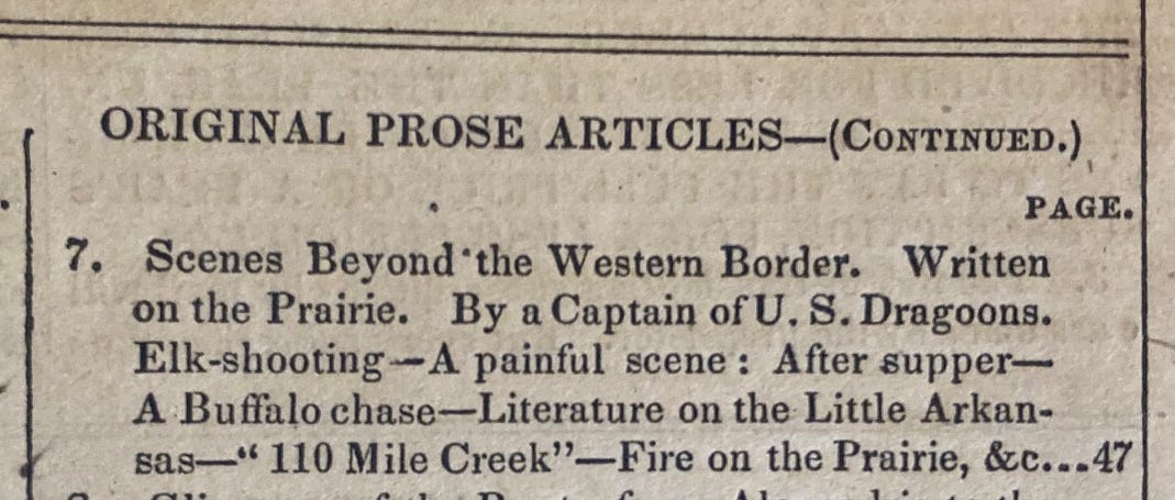 Scenes Beyond the Western Border in the Southern Literary Messenger Volume 18, January 1852, page 49; reprinted in Scenes and Adventures in the Army, pages 279-280.