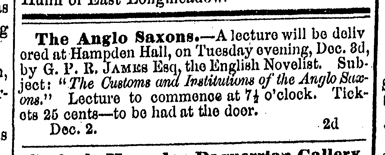 December 1850. Lecture on the Anglo-Saxons delivered “by G. P. R. James Esq, the English Novelist” at Hampden Hall in Springfield, Mass. on December 3, 1850.
