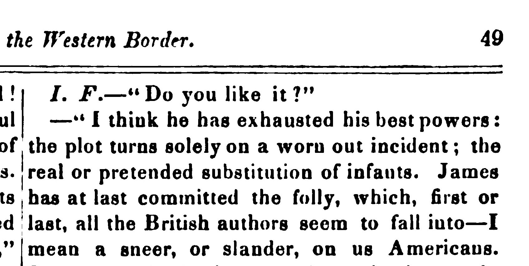 Overall, however, the critical reception of James’s False Heir on the banks of the Little Arkansas is decidedly negative. Asked point blank, “Do you like it?” the Captain of U. S. Dragoons faults the author for lackluster presentation and a hackneyed plot, in addition to the gratuitous slander “on us Americans.” As a specimen of James’s snobbery, the Captain reads aloud a cutting aside from the False Heir, admiring the putdown of “Americanism” as “coolly and deliberately” executed: