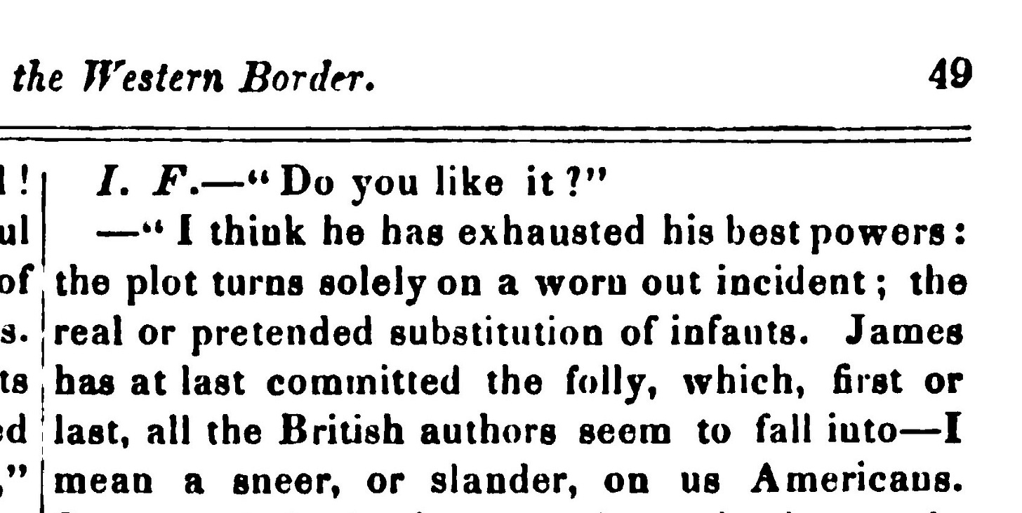 Granted, the “Literature” part mostly concerns the latest novel by the popular English author G. P. R. James. Nevertheless, the impromptu review of The False Heir on the Little Arkansas begins with a patriotic jab at the anti-American prejudice of every British writer, James included: