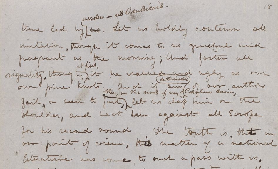 As may be seen in the detail from “Hawthorne and His Mosses” in manuscript, shown above, Melville altered the sentence with clear intent. Before revision, as copied in the handwriting of Melville’s wife Lizzie, the key sentence had ended “… led by us.” Melville struck through “us” to finish it with “ourselves—us Americans.”