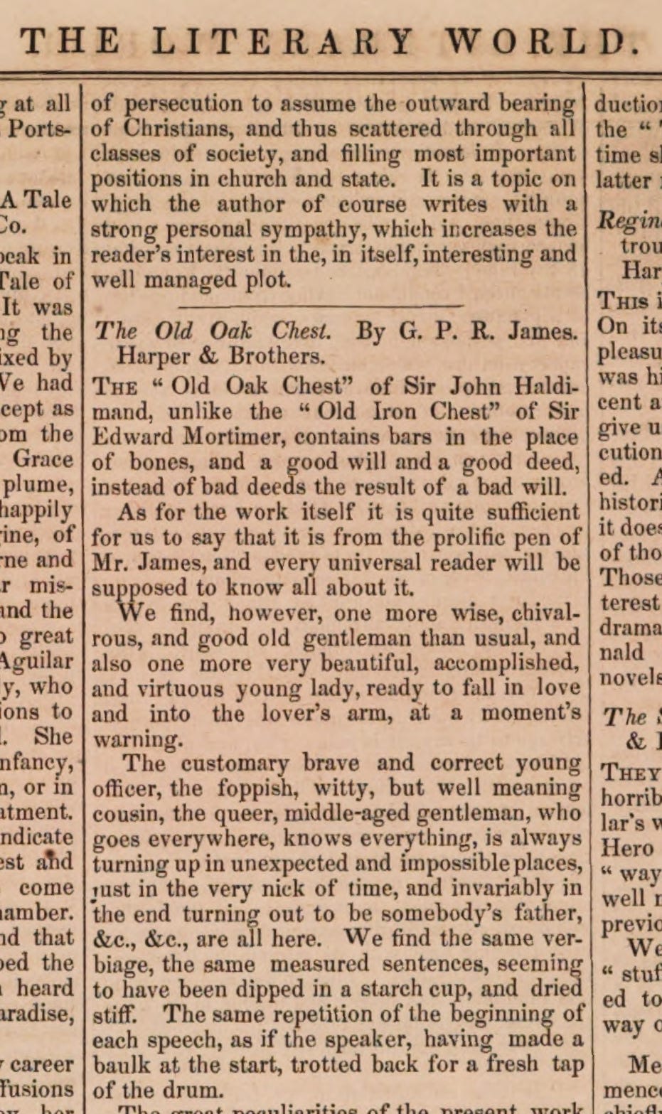 July 1850. Anticipating the same complaint by I. F. in “Scenes Beyond the Western Border,” the anonymous reviewer of James’s novel the Old Oak Chest in the New York Literary World for July 6, 1850 criticized James’s annoying habit of making his characters repeat "the beginning of each speech."