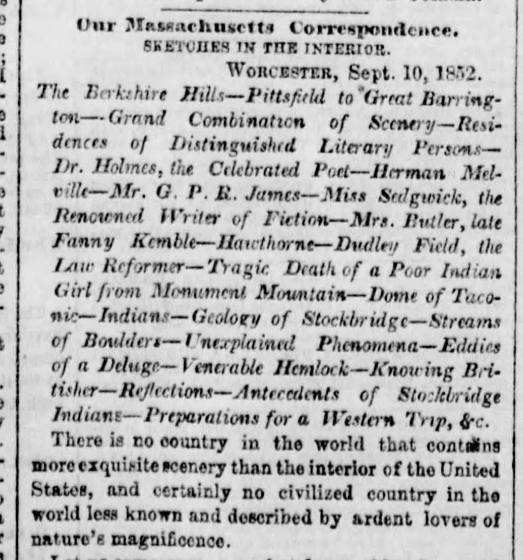 September 18, 1851. “Massachusetts Correspondence” of the New York Herald links the names “Herman Melville—Mr. G. P. R. James” with other famous “Literary Persons” dwelling “amidst the grand and beautiful Berkshire hills.” As the Herald correspondent goes on to report, “Mr. G. P. R. James, the English author…has lately bought a farm of about 300 acres in the neighborhood, comprising a large part of the celebrated Monument Mountain. This farm lies on the high-road from Stockbridge to Great Barrington, about a mile and a half from the former place, and is watered by several beautiful streams. Mr. James has lately here erected a picturesque farm house.”